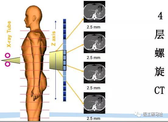 多層螺旋CT奠定了現代CT的設計架構,是CT技術的第二次飛躍。她創造性地在Z 軸上設置多排探測器,機架旋轉一周能獲得多幅斷層圖像,提高掃描速度和圖像縱向分辨率。從此,各大CT廠商開始“拼探測器”!