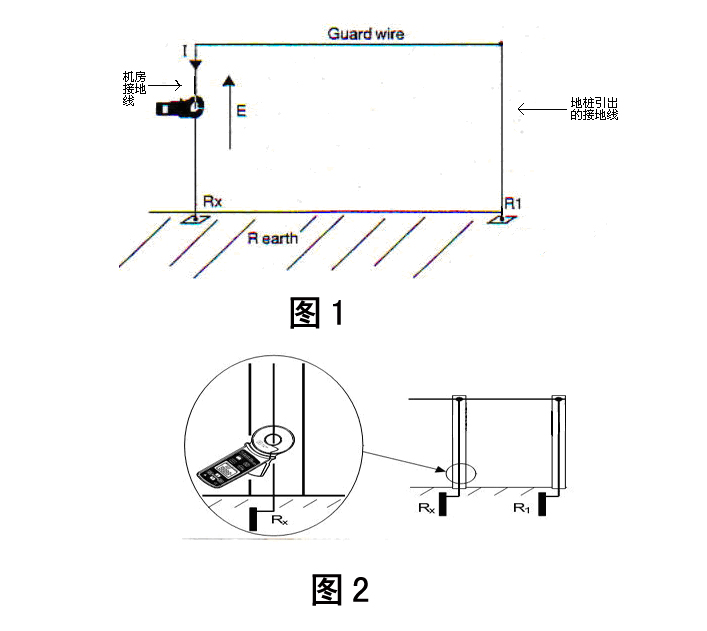 1、如果以機房為中心的半徑10米范圍內沒有用作檢測的輔助接地裝置,則需在原機房接地裝置的1平方米面積中再次打入一根深度不小于1.0——1.5米的地樁作為檢測回路的輔助接地端。再從其地樁上引出一根截面積不小于16平方毫米的黃綠銅質接地線與機房原接地相連形成檢測回路(如圖1所示)。打開鉗型接地電阻測試儀,切換到電阻測量功能,將儀器套住機房接地線端(如圖2所示),即可測得機房的接地電阻阻值Rx。按要求,所測得的接地電阻阻值應不大于4歐姆。同理將測試儀套住獨立接地裝置引出的黃綠接地線,可測得輔助接地裝置的接地電阻阻值R1。